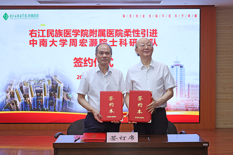 正值中国共产党成立102周年之际,7月1日—2日,中南大学周宏灏院士率领其科研专家团队一行4人,莅临附属医院(临床医学院)开展高水平学术合作交流,并正式签约进驻附属医院(临床医学院),为推动学校和医院的一流学科建设、高层次人才队伍培养、科技成果转化、老区医疗卫生事业发展注入巨大的能动效能,更好地为桂滇黔三省交界区各族群众提供更加优质、高端的医疗服务。学校党委副书记、校长李雪斌和附属医院(临床医学院)党委林栩书记等医院领导出席签约仪式并陪同调研。