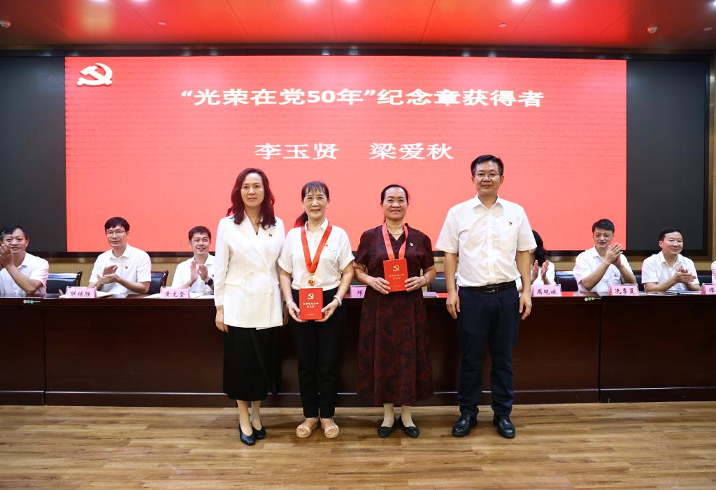 邓砚书记、李雪斌校长向李玉贤、梁爱秋两位老党员颁发“光荣在党50年”纪念章。