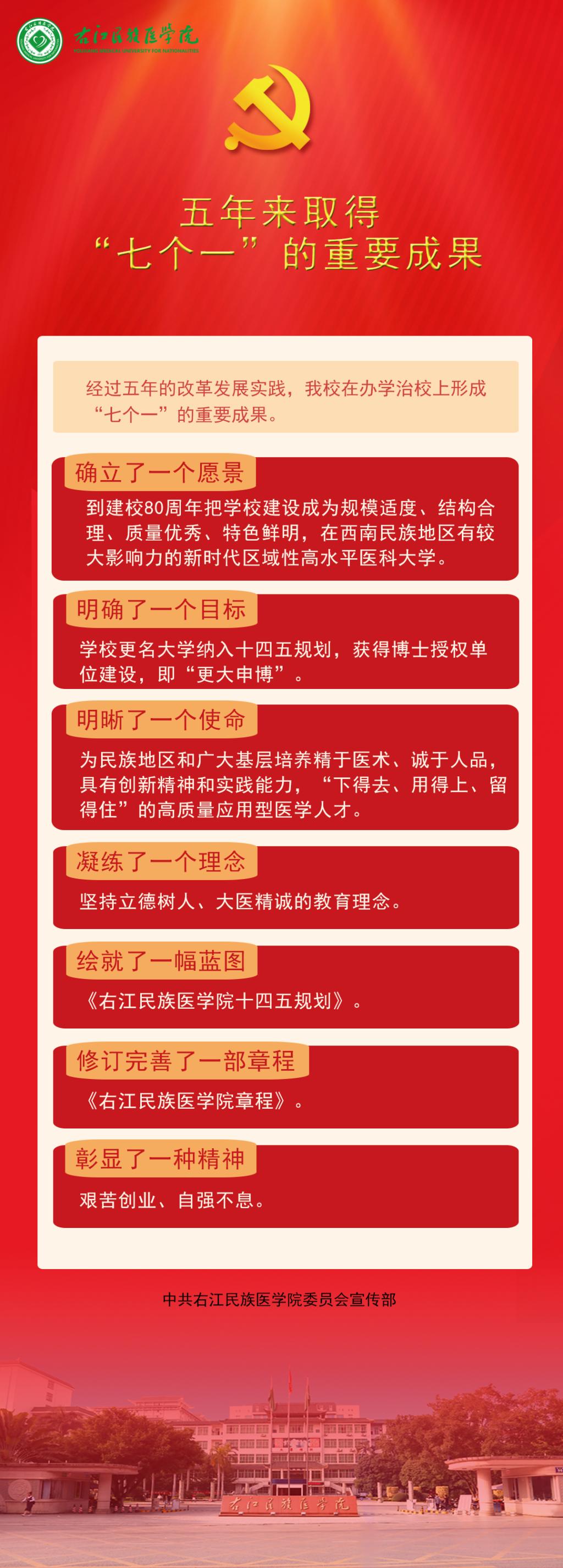 经过五年的改革发展实践,Beat365官网在办学治校上形成“七个一”的重要成果。确立了一个愿景:到建校80周年把学校建设成为规模适度、结构合理、质量优秀、特色鲜明,在西南民族地区有较大影响力的新时代区域性高水平医科大学。明确了一个目标:学校更名大学纳入“十四五”规划,获得博士授权单位建设,即“更大申博”。明晰了一个使命:为民族地区和广大基层培养精于医术、诚于人品,具有创新精神和实践能力,“下得去、用得上、留得住”的高质量应用型医学人才。凝练了一个理念:坚持立德树人、大医精诚的教育理念。绘就了一幅蓝图:《Beat365官方网站“十四五”规划》。修订完善了一部章程:《Beat365官方网站章程》。彰显了一种精神:艰苦创业、自强不息。