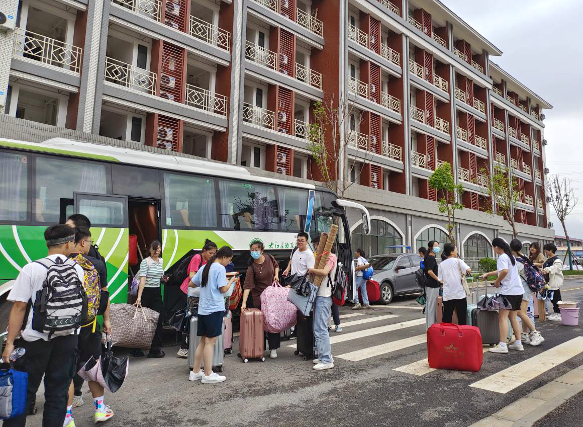 学生志愿者乘坐大巴车抵达百东校区。