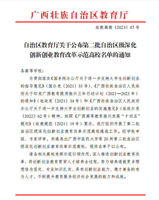 近日,自治区教育厅公布第二批自治区级深化创新创业教育改革示范高校名单。经自主申报与专家评审,Beat365官网获评为第二批自治区级深化创新创业教育改革示范高校。