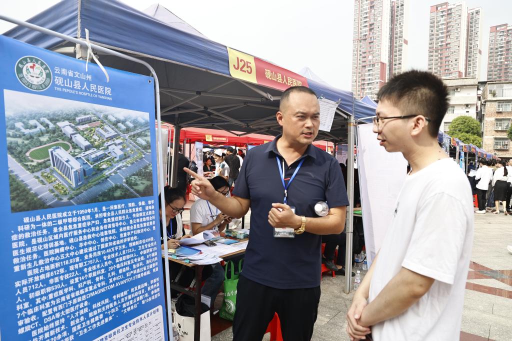 云南省文山州砚山县人民医院医务科主任钱猛说:我们医院在云南省129个县市是排名第3的县级二甲医院,右医给我们输送了很多优质人才,我们有很多科主任都是右医毕业的,比如我们消化内科主任、急诊科主任、康复科主任、泌尿外科主任等等,很优秀,非常务实,医疗技术非常精湛,医德很好,所以我们这次带来130个岗位来招右医的人才,其中临床专业招70人。
