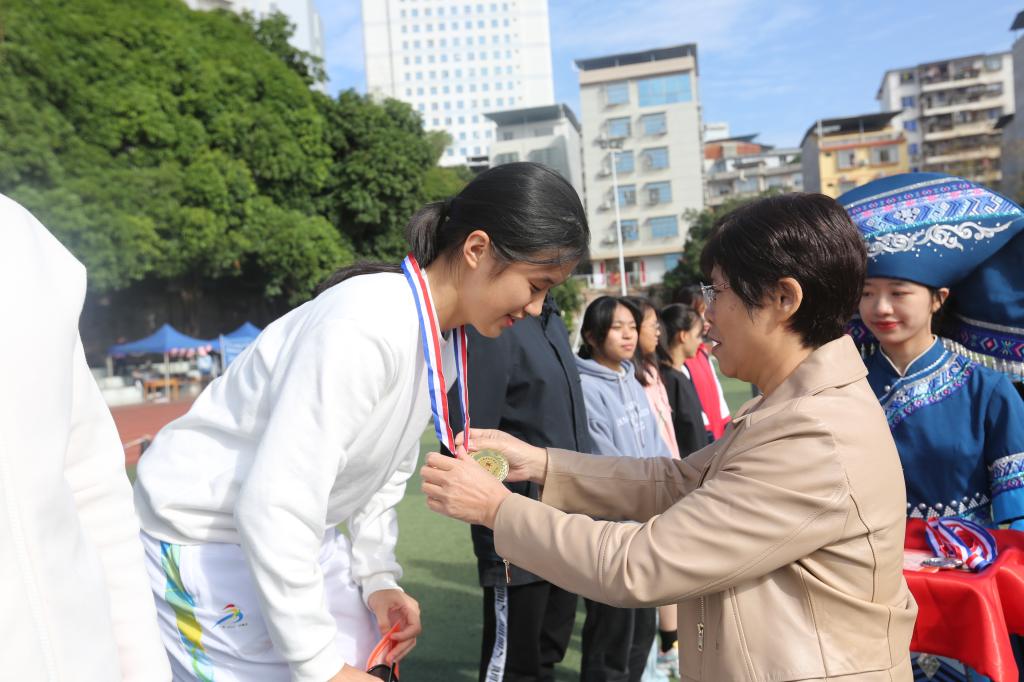 11月17日上午10点,Beat365官网举行第五十届校运会第一场颁奖仪式,由学校党委副书记赵丽娟为获奖运动员颁奖,来自2022级预防2班的陈可怡同学在女子100米决赛上发挥出色,以13秒8的好成绩斩获金牌,取得本届运动会的首枚金牌。