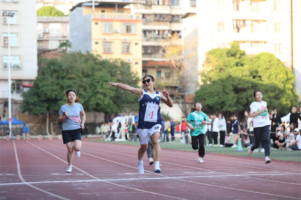一声枪响伴着飒爽的秋风,她们像一支箭离弦向终点冲去,起步即是最后的冲刺,大家你追我赶,各不服输,以全力冲向终点。引来场外观众一阵欢呼,最后陈可怡同学一骑绝尘,荣获冠军。