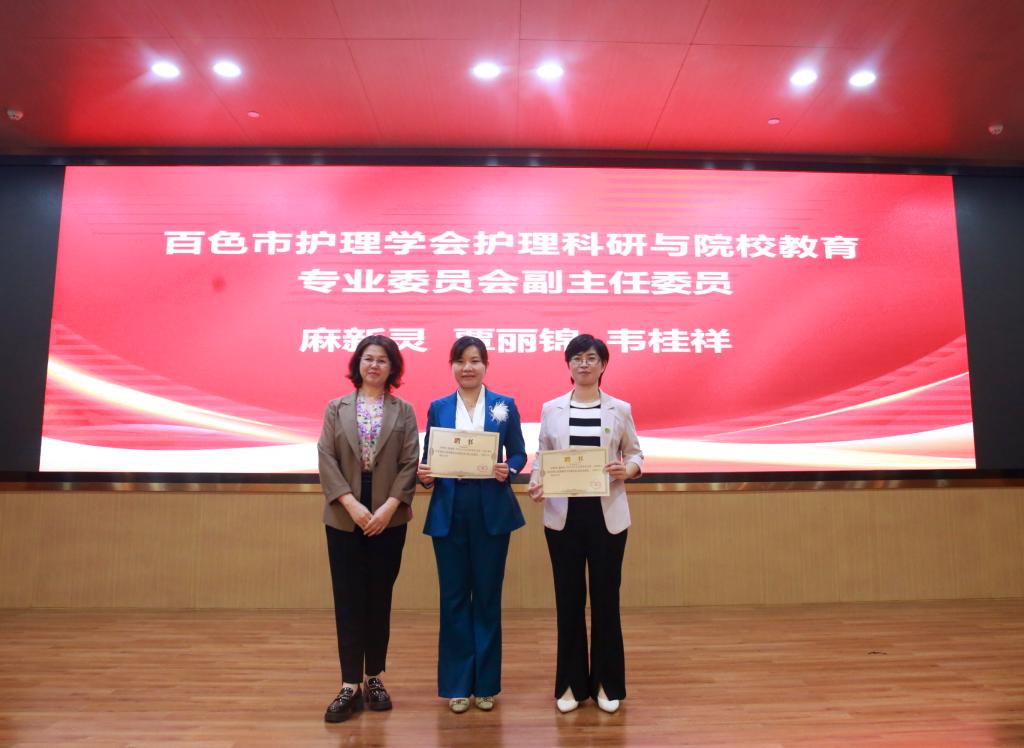 广西护理学会护理科研与院校教育专业委员会副主任委员韦桂源为韦桂祥、麻新灵、覃丽锦副主任委员颁发聘书。