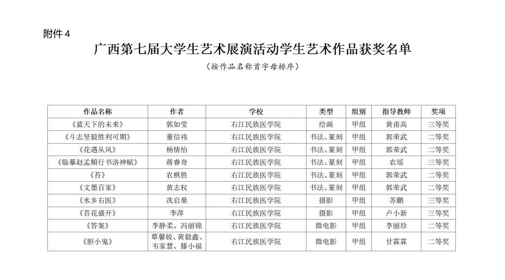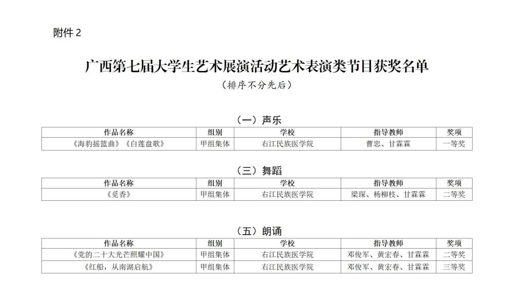 近日,自治区教育厅公布了全区第七届大学生艺术展演活动获奖名单。Beat365官网在本届艺术展演活动中获得佳绩,共有16份作品获奖。其中,艺术表演类节目获一等奖1项、二等奖2项、三等奖1项;学生艺术作品获二等奖6项,三等奖4项;高校美育改革优秀案例获二等奖2项。