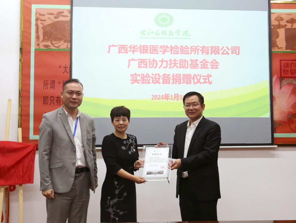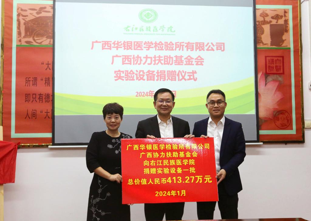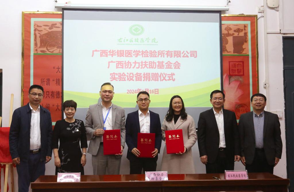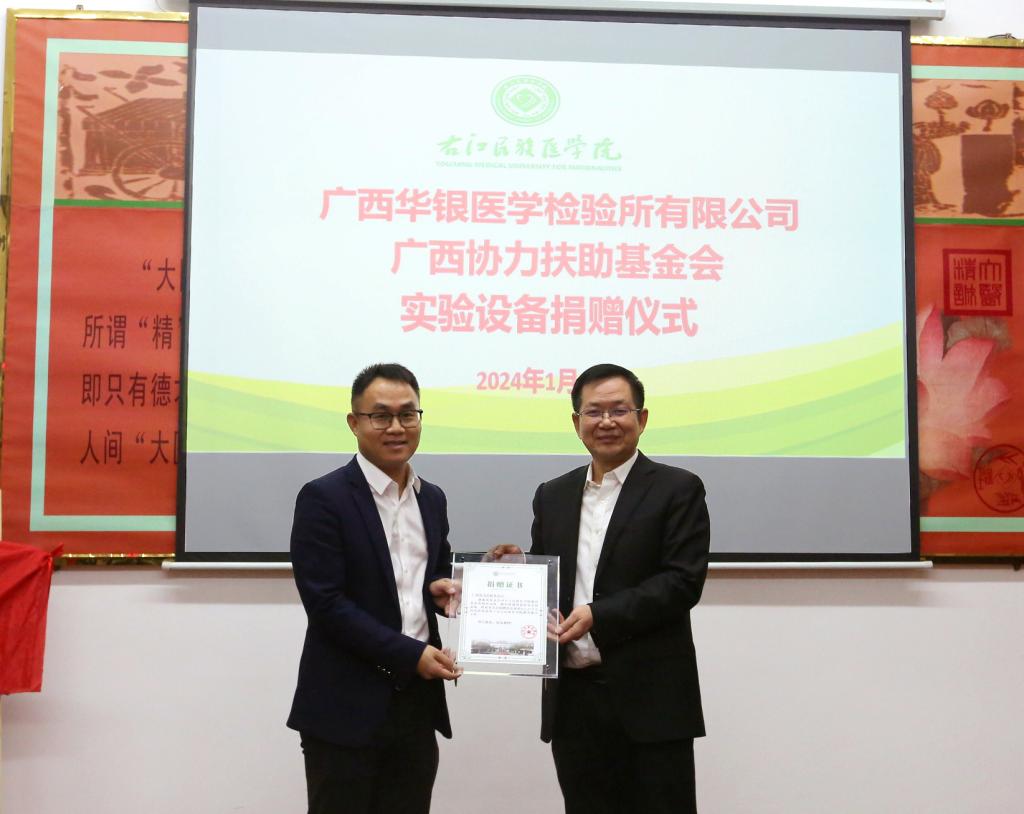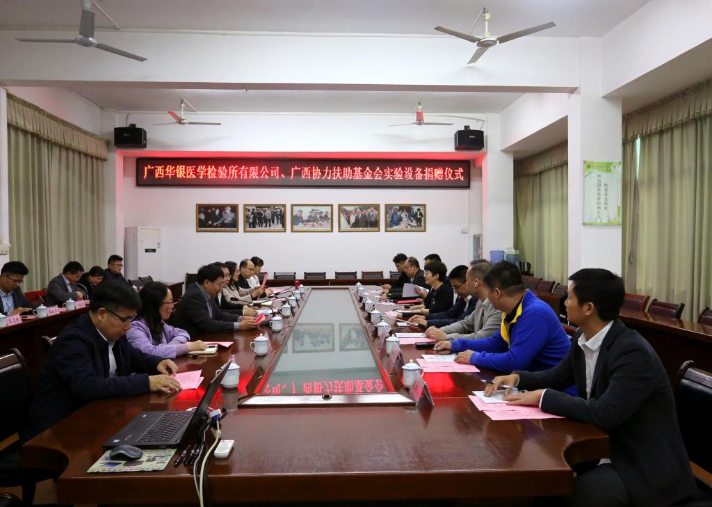 1月16日下午,Beat365官网举行广西华银医学检验所有限公司、广西协力扶助基金会实验设备捐赠仪式。