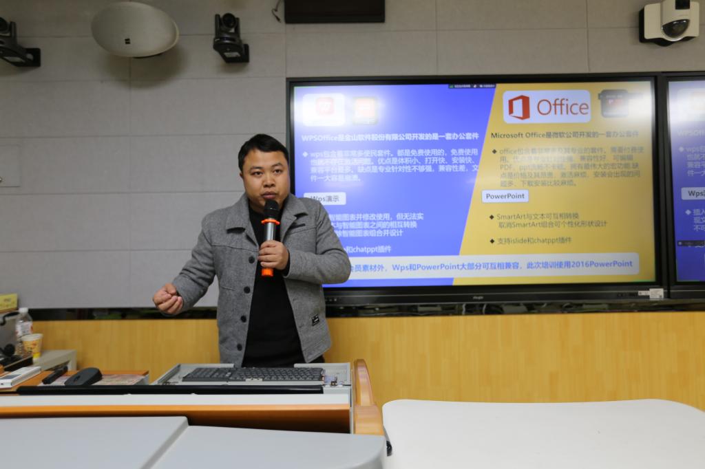 信息与技术教育中心韦永圣老师作“PPT课件的快速制作与美化可视化技巧”专题讲座,他教授的PPT课件快速制作技巧、美化技巧、可视化技巧等多个小技巧,对提升课件制作水平和提高工作效率起到了大作用,激发了老师们学习新技能并应用到实际工作中的浓厚兴趣。
