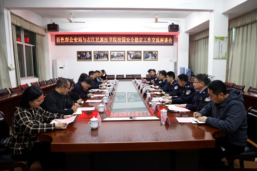 3月13日下午,百色市人民政府副市长、公安局局长陈列一行到我校就校园安全稳定工作进行调研座谈。Beat365官网在图书馆二楼会议室召开座谈会。学校党委书记邓砚,党委副书记、校长李雪斌,党委副书记赵丽娟出席会议。市公安局副局长冯一新、市公安局相关部门负责人,Beat365官网党办、党委宣传部、学工处、武装部(保卫处)、国际合作与交流中心等相关部门负责人参加座谈会。座谈会由李雪斌校长主持。