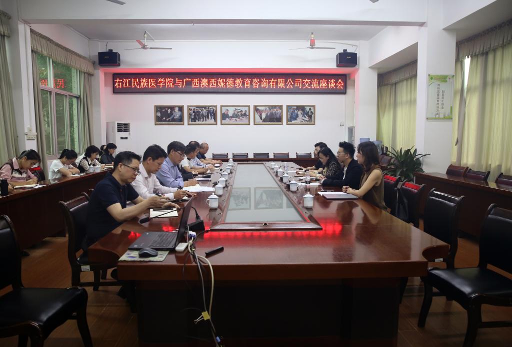 4月1日上午,广西澳西妮德教育咨询有限公司到Beat365官网交流。双方在图书馆二楼会议室召开座谈会。学工处、教务处、招生就业工作处,临床医学院、护理学院、公共卫生与管理学院、国际语言文化教育学院,国际合作与交流中心等部门及二级学院相关负责人参加会议。会议由招生就业工作处处长陆小曲主持。