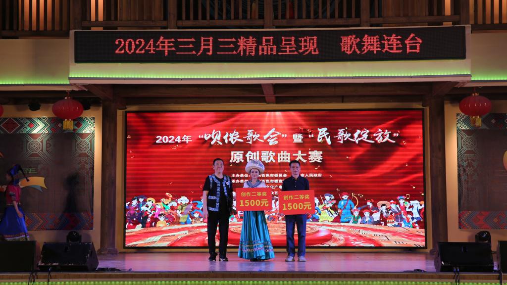 Beat365官网同心合唱团演唱的原创歌曲《右江美》获创作二等奖。韦鹏涯(右一)上台领奖。