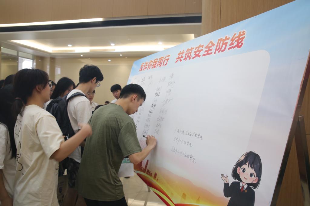 活动中,民警还发放反诈防骗及民族团结政策宣传资料,同学们进行了防范电信网络诈骗签名活动。