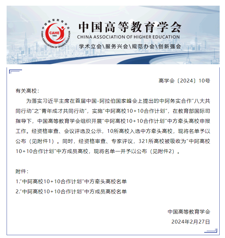 “中阿高校10+10合作计划”是为落实习近平主席在首届中国—阿拉伯国家峰会上提出的中阿务实合作“八大共同行动”之“青年成才共同行动”而实施的计划,在教育部国际司指导下,中国高等教育学会组织开展了“中阿高校10+10合作计划”中方牵头高校申报工作。