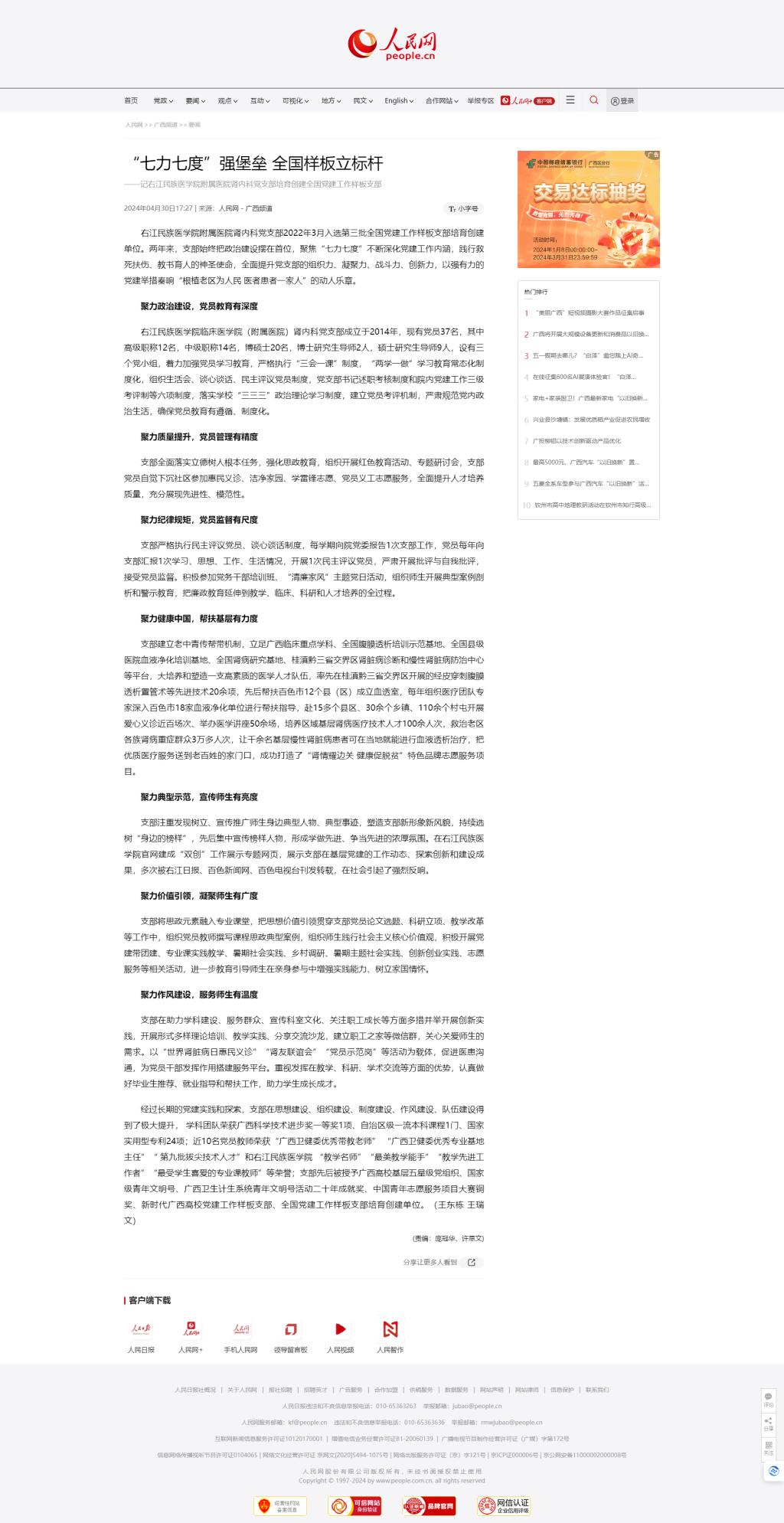 2024年4月30日,人民网刊发报道:“七力七度”强堡垒 全国样板立标杆——记Beat365官方网站附属医院肾内科党支部培育创建全国党建工作样板支部。