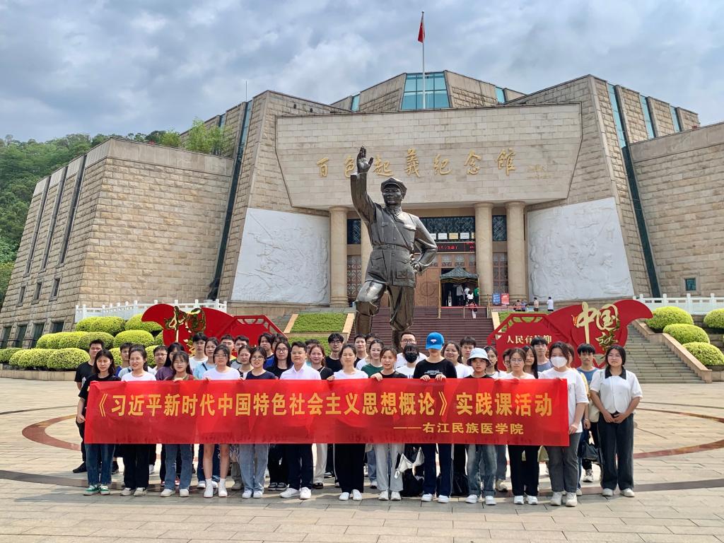 学院依托思政教育实践教学基地,把思政课与红色革命教育基地相结合,带领学生到粤东会馆、百色起义纪念碑、百色起义纪念馆等红色资源进行现场教学,引导大学生传承红色基因、赓续红色血脉;思政课与乡村振兴工作相结合,引导学生关注农村,指导学生到田间地头讲微党课、开展研究性学习,培养服务基层的意识和能力;思政课与医学实践相结合,带领学生到龙景社区卫生服务中心、养老院、特殊学校等地开展实践,培养学生良好的医德医风;思政课与爱国主义教育宣传相结合,围绕国家重大主题开展思政活动,开展“建党100周年”主题演讲、党的二十大主题演讲、两会主题宣讲等活动,增强学生的爱国情感和社会责任感;思政课与“大中小思政课一体化”建设相结合,引导学生走进百色市滨江小学、太阳花幼儿园等,实现思政教育“大手拉小手”的双向互动。