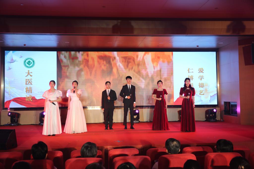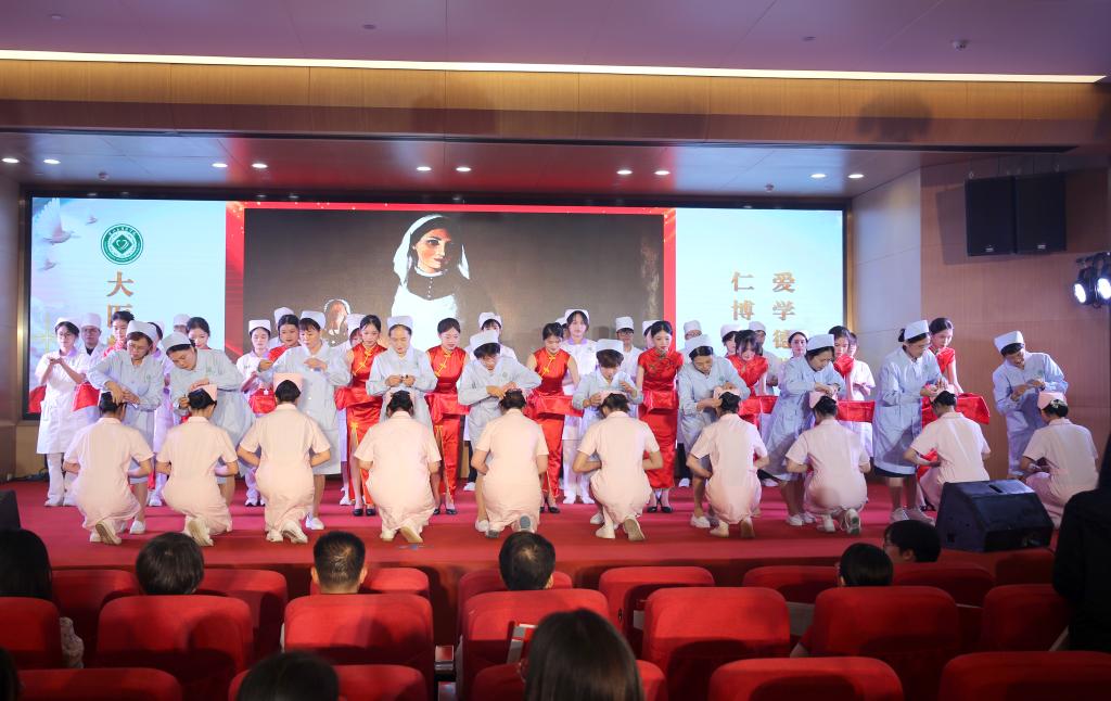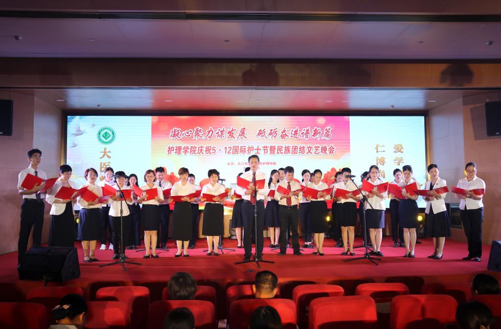 5月19日晚,护理学院举办2024年庆祝“5·12”国际护士节暨民族团结文艺晚会。图为朗诵《护士赞歌》。