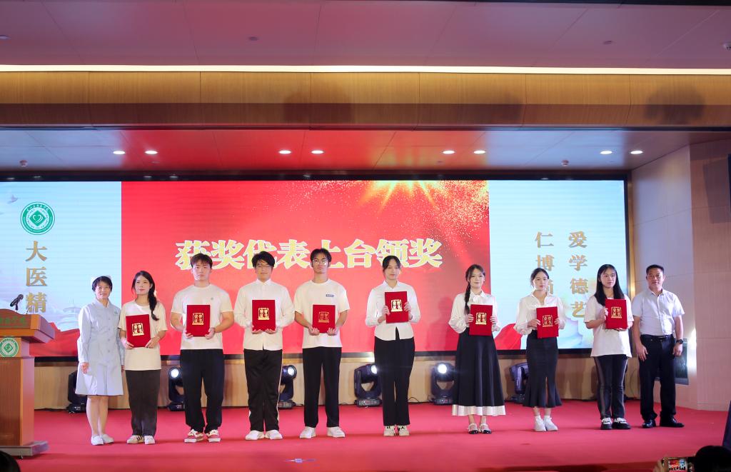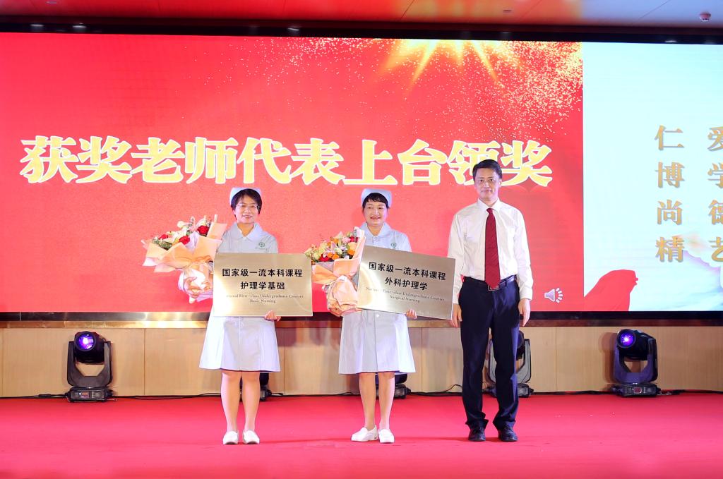 护理学院党委副书记黄上峰主持表彰环节,宣读2023年护理学院在党的建设、教育教学、专业建设、课程建设、学术科研等方面取得成绩,以及护理学院学生在大学生创新创业大赛、学生护理技能大赛、学生社会实践、院系年度优秀的集体奖和个人奖项,与会领导老师给教师、学生代表送花、颁奖祝贺。