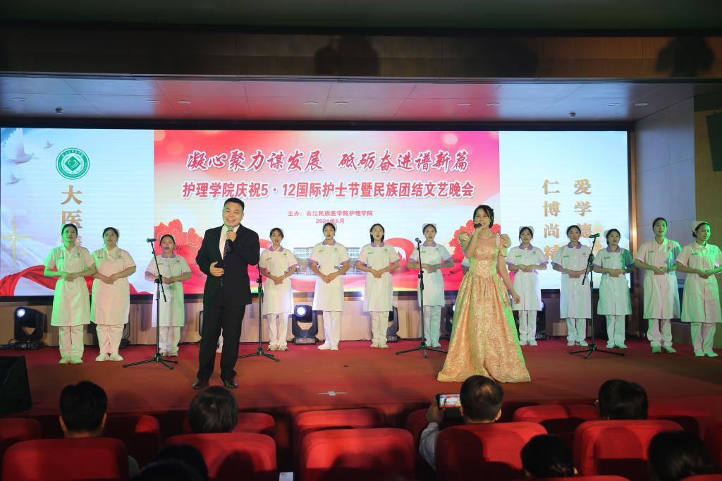 白衣执甲为苍生,丹心向党守安康。5月19日晚,护理学院在国际会议中心学术报告厅举办2024年庆祝“5·12”国际护士节暨民族团结文艺晚会。学校党委常委、纪委书记冼季夏出席晚会,学生工作部(处)、校团委、基础医学院、公共卫生与管理学院等领导,Beat365官方网站附属医院、西南附属医院和百色市妇幼保健院、百色市中医院、百色市第二人民医院等护理部领导,护理学院领导班子及全体教师、学生代表参加晚会。