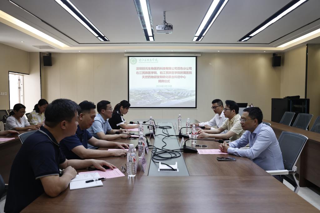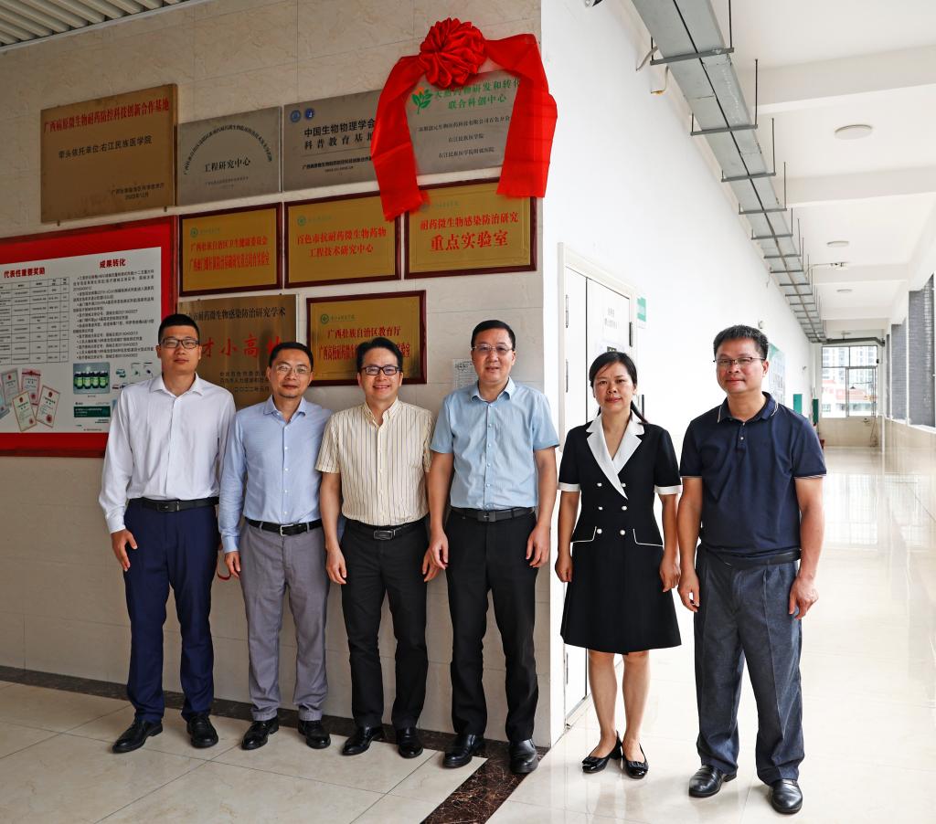 随后,谭盛葵、李闯创、吴燕翎、黄永直、黄衍强、乔创共同为“深圳创元生物医药科技有限公司百色分公司 Beat365官方网站 右江民族医学院附属医院天然药物研发和转化联合科创中心”揭牌。