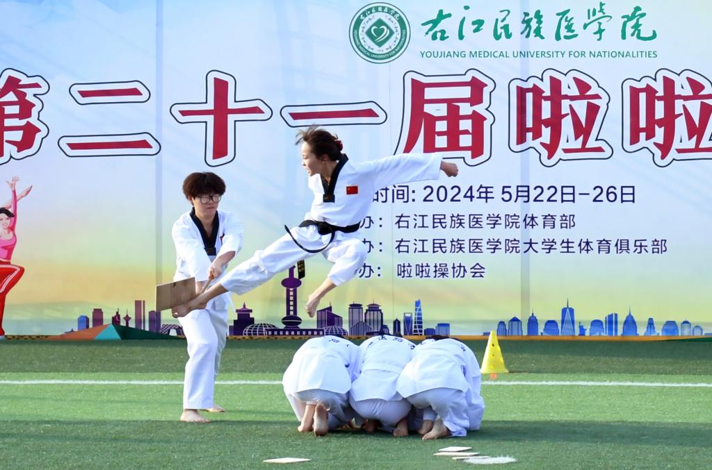 在比赛现场,各参赛队伍身着统一的服装,以饱满的热情和精湛的技艺,为观众呈现了一场场精彩的啦啦操表演。他们或跳跃、或旋转、或翻滚,动作流畅而富有节奏感,不仅展示了啦啦操的基本动作、技巧和独特魅力,还融入了多种创意元素,使得整个比赛更加丰富多彩。此外,学校啦啦操协会、瑜伽社、跆拳道协会还为同学们带来了精彩绝伦的才艺展演,使现场观众不时爆发出热烈的掌声和欢呼声。