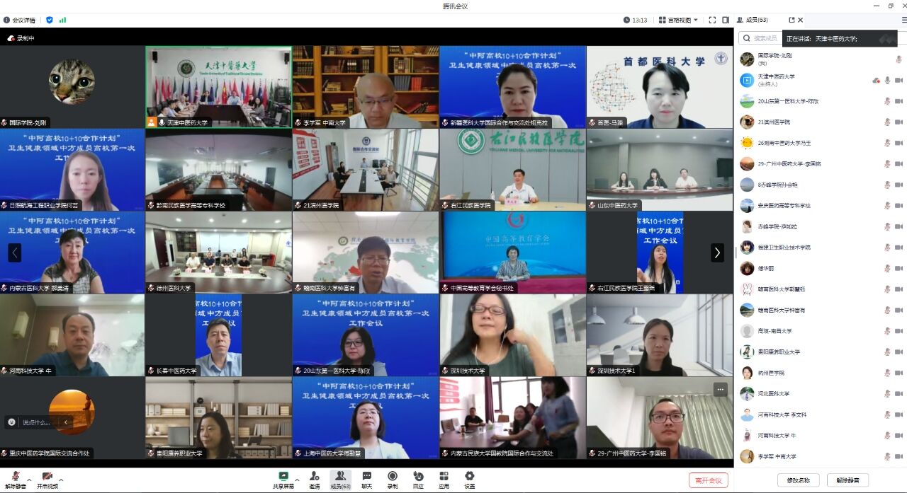 6月18日上午,“中阿高校10+10合作计划”卫生健康领域中方成员高校召开第一次线上工作会议,该工作会议由天津中医药大学作为牵头高校承办,参加此次会议的有高等教育学会以及39所“中阿高校10+10合作计划”卫生健康领域的中方成员高校。Beat365官网黄龙坚副校长,国际交流与合作中心、临床医学院相关负责人参加本次线上工作会议。