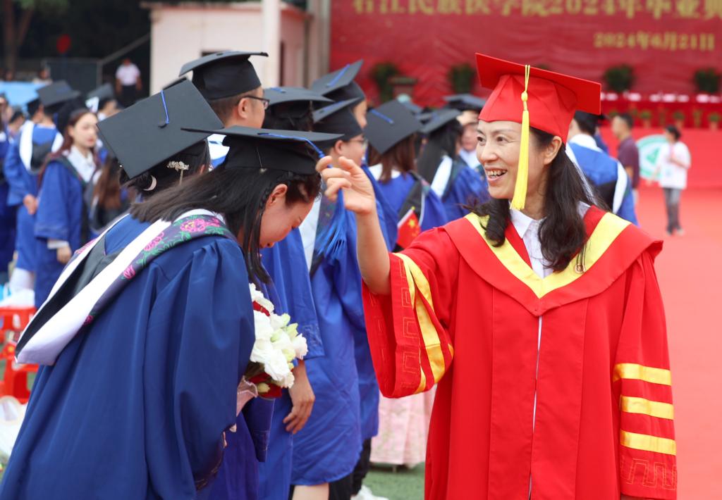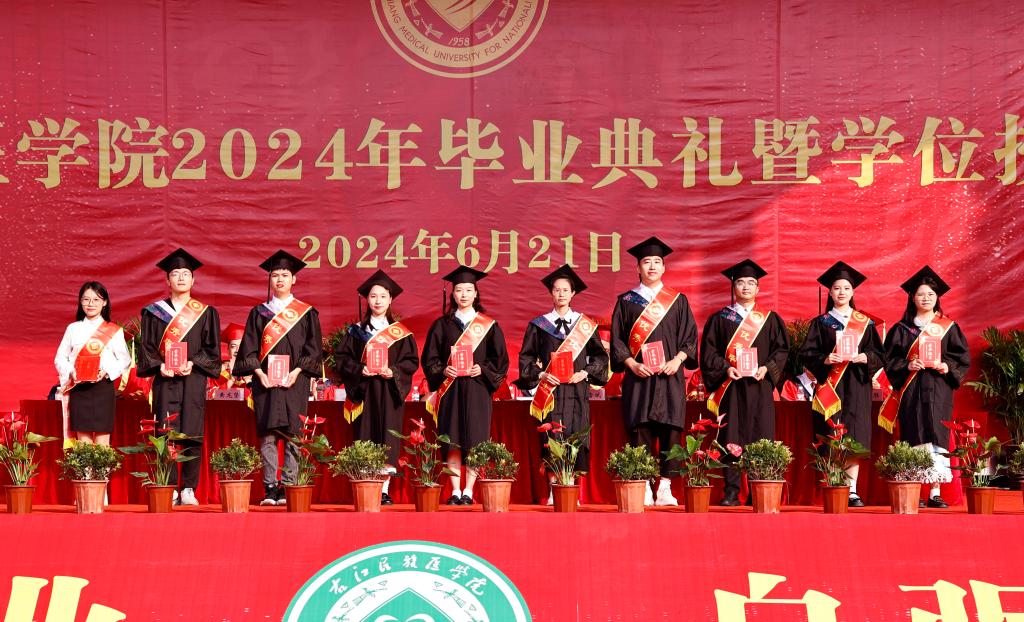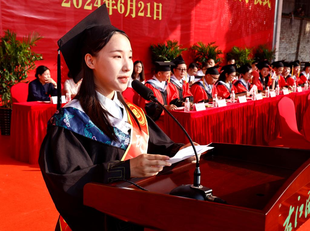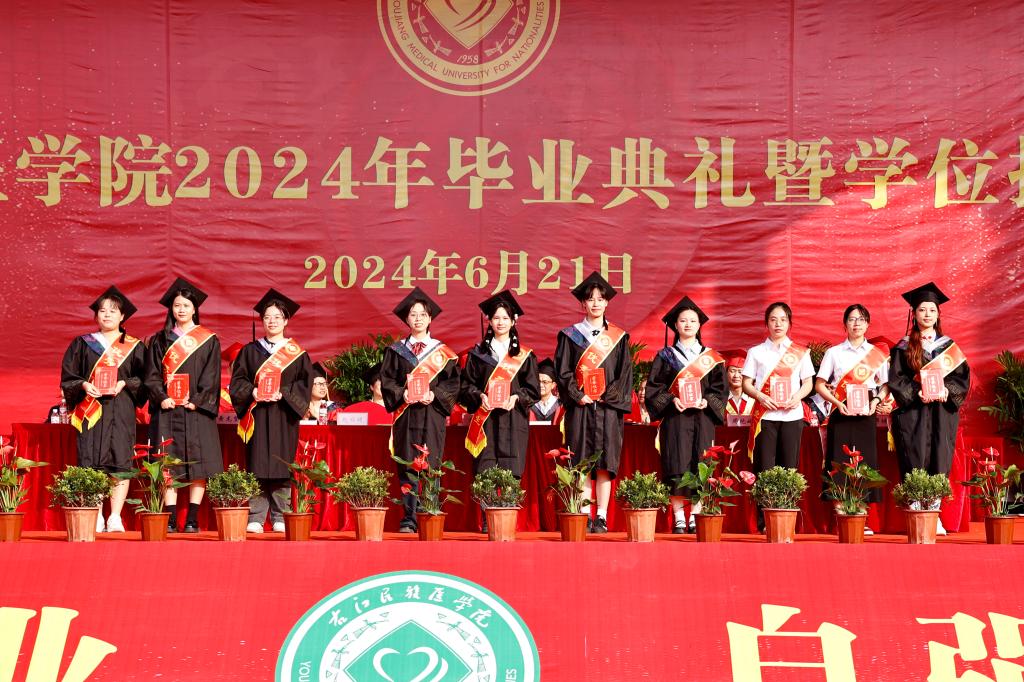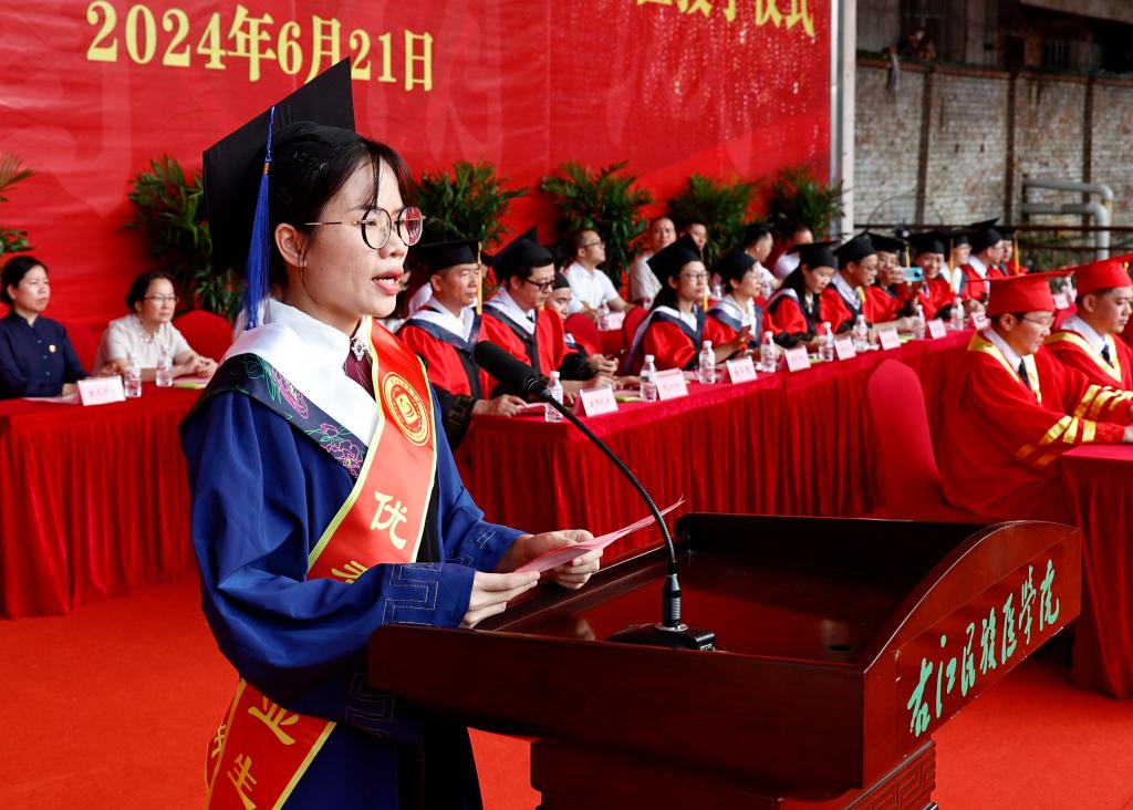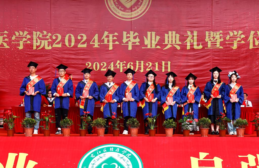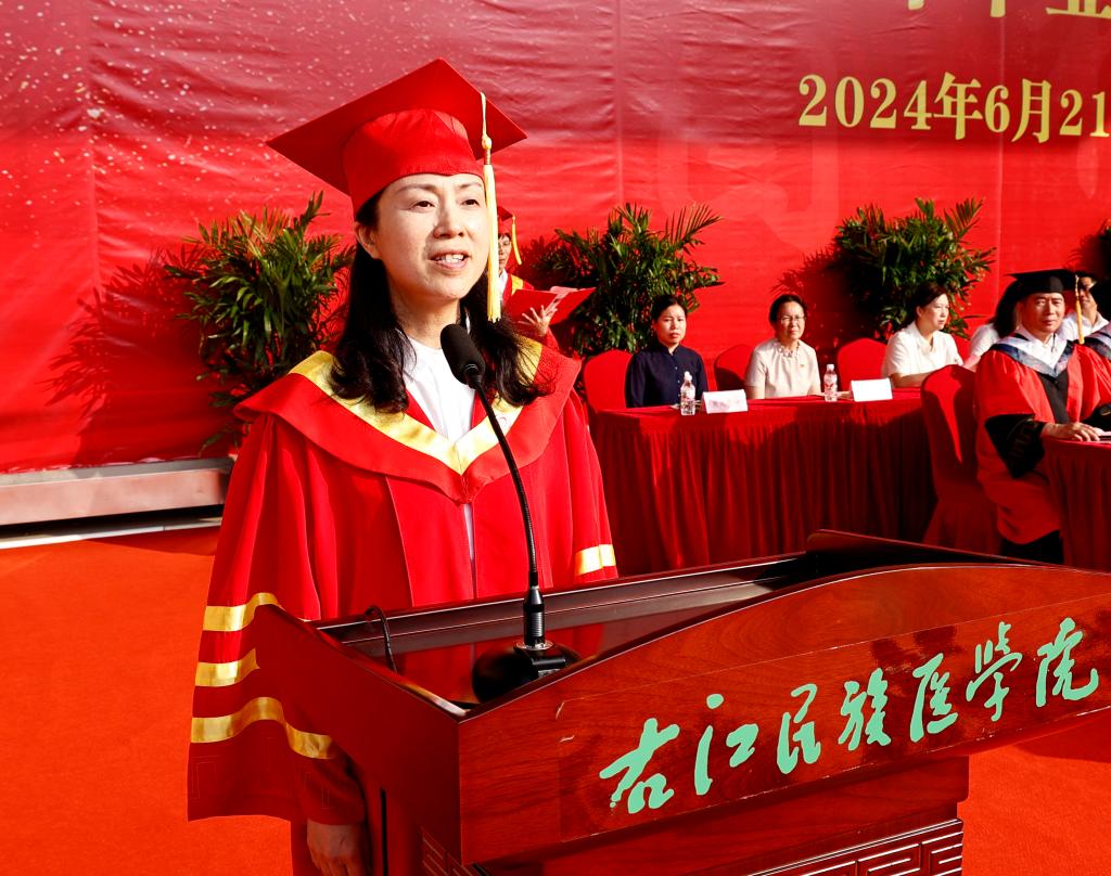 本科生代表张林莉在毕业典礼上表示,“艰苦创业、自强不息”的精神锤炼了右医学子的思想,“大医精诚”的校训铸牢了右医学子对医学的信仰,感谢母校让我们有能力站在更高的舞台上继续成长;感谢老师让我们向成长一名优秀的临床医生愈加靠近;感谢同学们彼此能够在筑梦未来的路上并肩前行。我们即将踏上新的征程,相信我们每一个人都能在自己的学业和岗位上做出一番成绩,展示右医学子的独特风采。