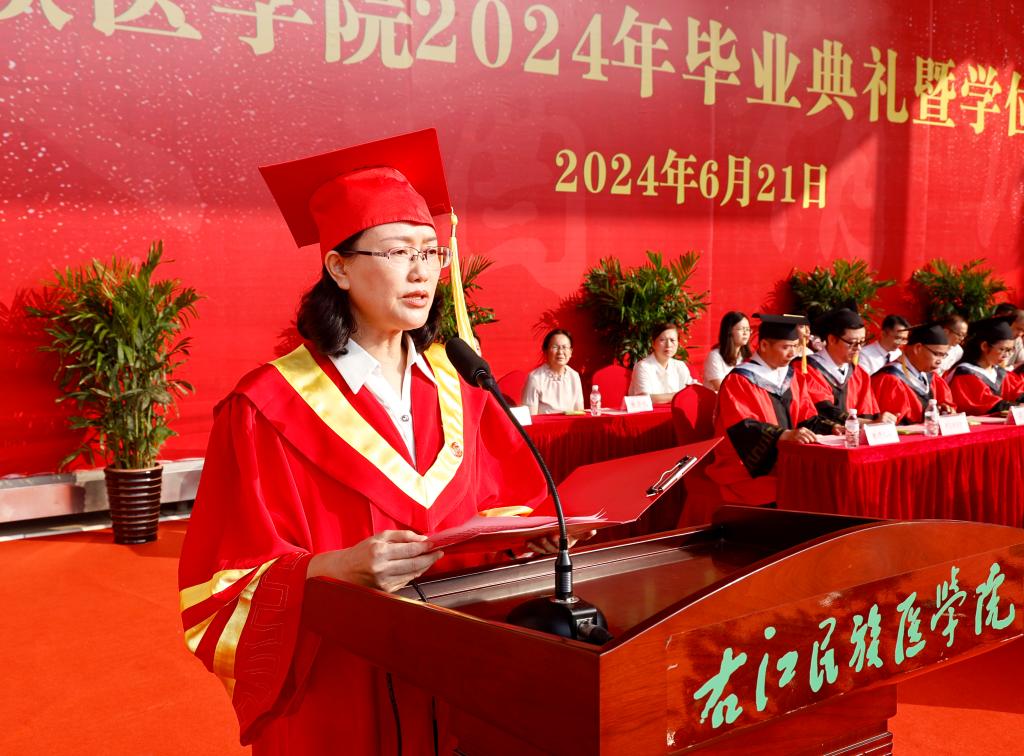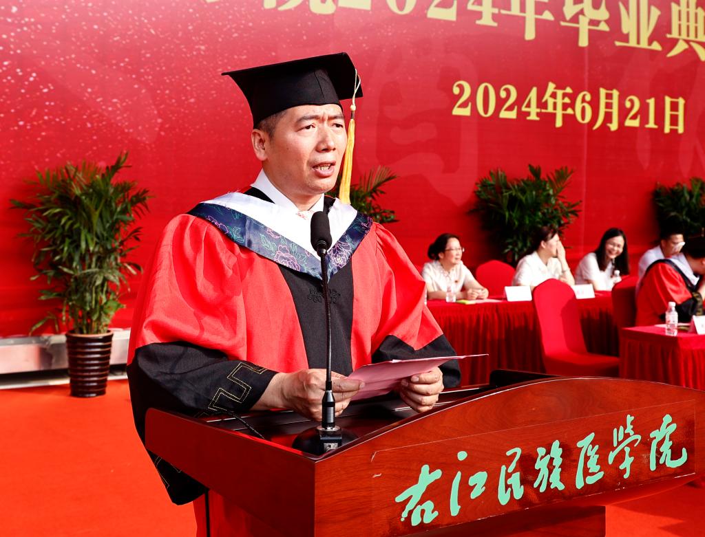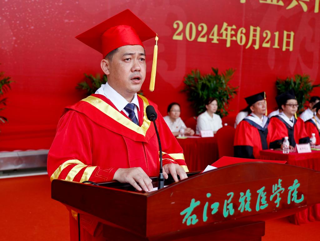 学校党委副书记、校长李雪斌发表了热情洋溢的讲话,他以《以“热辣”青春追逐“滚烫”梦想》为主题,回顾了同学们在学校学习生活期间的历程,对同学们的美好未来寄予了殷切希望。他寄语同学们,要不坠青云之志,争当“挺膺担当、堪当重任”的时代新人,扎根祖国大地,下得去、用得上、留得住,弘扬“艰苦创业,自强不息”的右医精神,与祖国同心、与时代同向、与人民同行,做铸牢中华民族共同体意识的传播者、实践者、推动者,成为能堪当民族复兴重任的时代新人;要把握医学温度,争当“精于医术、诚于人品”的人间大医,时刻牢记医学的初心使命,守医德、正医风、弘医道,护佑生命、救死扶伤、甘于奉献、大爱无疆,让医学人文之花美丽绽放;要秉持崇德向善,争当“积极乐观、向阳而生”的追光之人,无论在顺境还是逆境中都能保持自己的本色,坚定“把每一项平凡工作做好就是不平凡”的恒心,保持“把每一件小事情做好就是大事业”的匠心,逆风飞翔、向阳而生。他还希望同学们,无论身居何方,都要记得自己的根与魂,记得人民的重托、母校的期待,不抛弃、不放弃、“总要赢一次”,以“热辣”的青春去追逐“滚烫”的梦想。