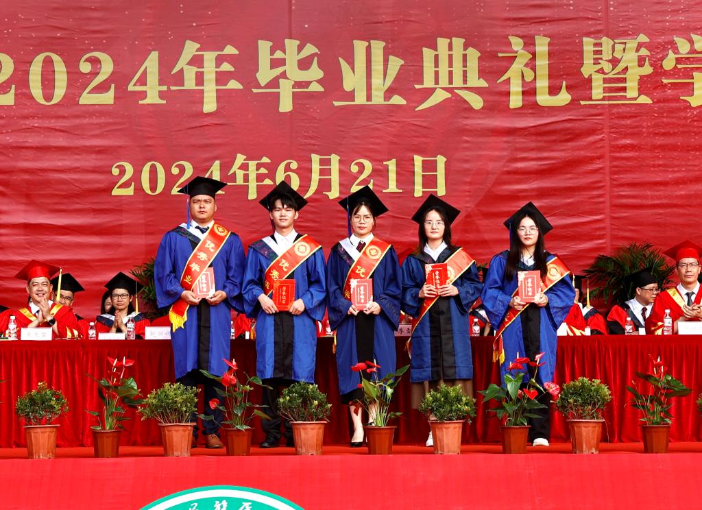 在典礼上,党委常委、副校长周艳娥宣读《表彰优秀毕业生的决定》文件,与会领导为优秀毕业生代表颁奖。党委常委、副校长黄龙坚宣读《关于授予毕业生学士学位和硕士学位的决定》文件,学校领导、各二级学院领导为全体获得学位的毕业生扶正流苏并合影留念。