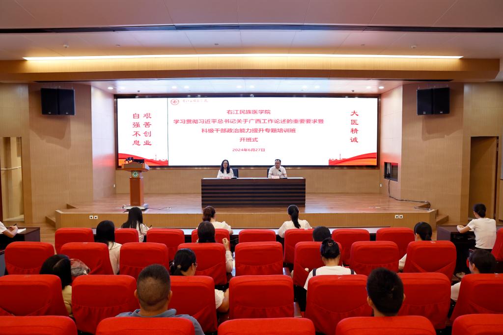 6月27日至28日,Beat365官网学习贯彻习近平总书记关于广西工作论述的重要要求暨科级干部政治能力提升专题培训班在国际会议中心学术报告厅圆满举行。学校党委书记邓砚出席培训班开班仪式,学校全体科级干部,Beat365官网派驻西林县脱贫攻坚(乡村振兴)第一书记、工作队员及各帮扶乡镇领导代表、各帮扶村村干部代表参加培训。开班仪式由党委组织部副部长吕维纯主持。