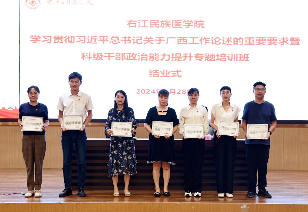 28日下午,培训班举行结业仪式,邓砚出席仪式并为参训学员颁发结业证书。参训学员深入交流学习收获,学员代表钟斌、何平发表结业感言,他们表示,要坚持以习近平新时代中国特色社会主义思想为指导,深刻学习领会习近平总书记关于广西工作论述的重要要求,全面提升“七种能力”,勇于直面问题、破解难题,把培训收获转化为干事创业、勇开新局的强大动力,为推进学校“更大申博”,建设新时代区域性高水平医科大学贡献力量。