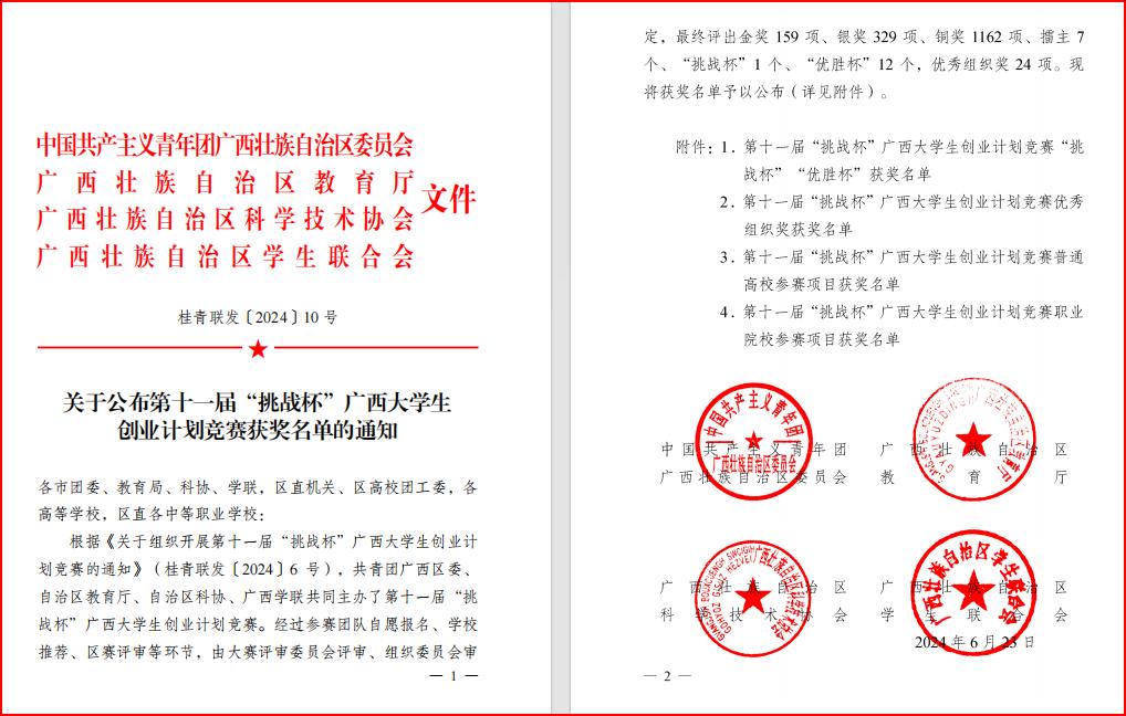 近日,由共青团广西区委、自治区教育厅、自治区科协、广西学联共同主办的第十一届“挑战杯”广西大学生创业计划竞赛落下帷幕。Beat365官网推报的30项作品中,有23项获奖,其中,荣获自治区金奖2项,银奖3项,铜奖18项,获奖数量创历史新高。