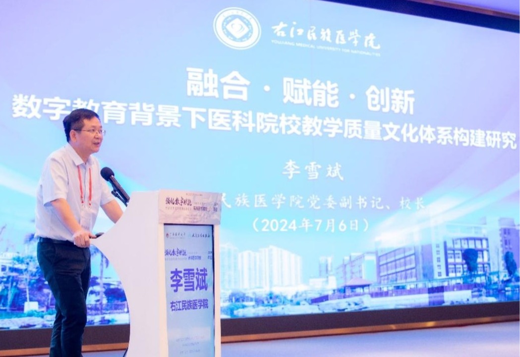 李雪斌校长代表学校作了《融合・赋能・创新 数字教育背景下医科院校教学质量文化体系构建研究》主题报告,简要介绍了Beat365官网办学历史、办学格局和办学定位,分享了Beat365官网数字教育背景下构建地方医科院校质量保障体系和质量文化为民族地区和广大基层培养大批新时代高质量“三得”医学人才的经验和做法。