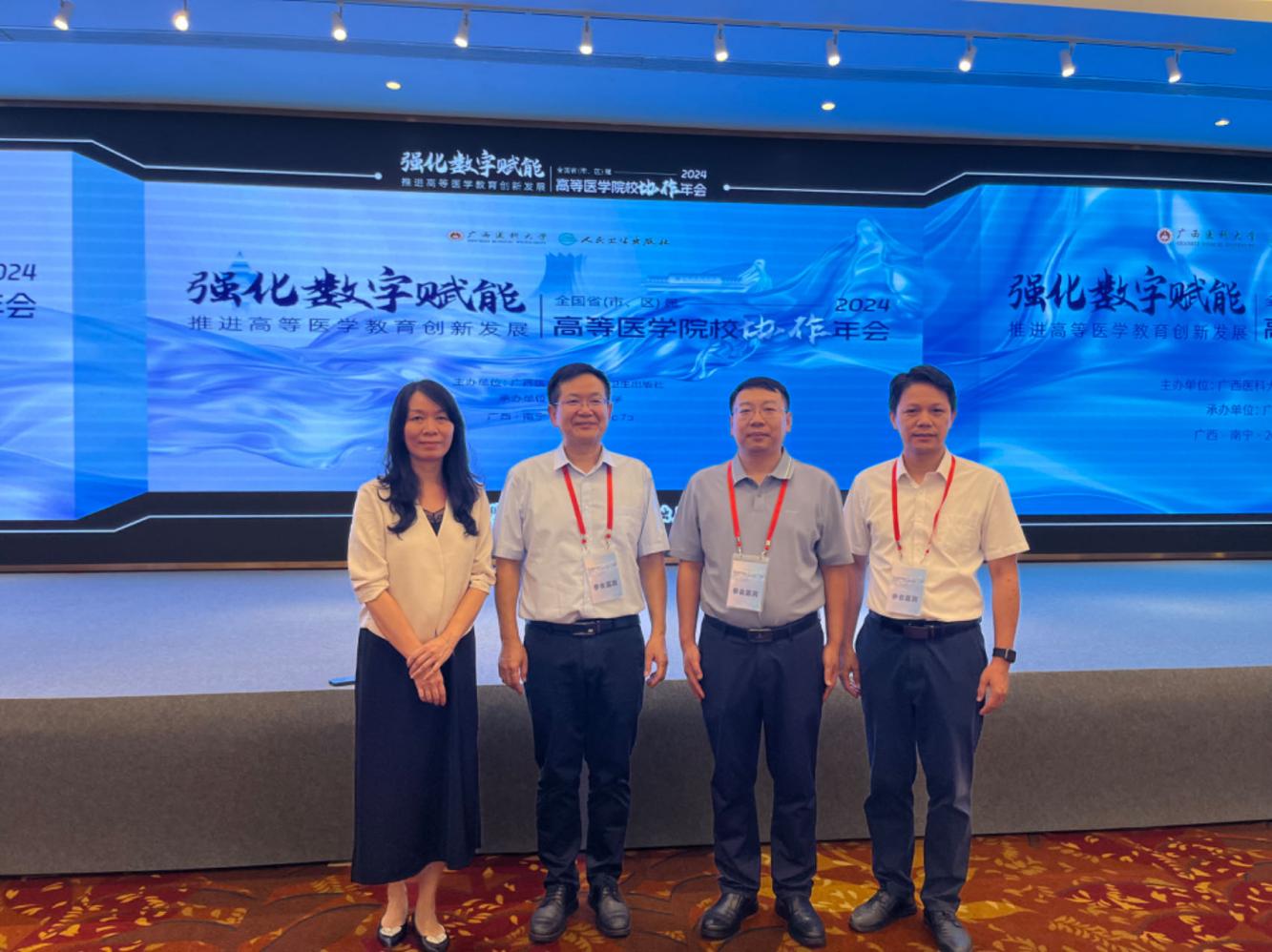 7月6日,广西医科大学与人民卫生出版社共同主办的2024年度全国省(市、区)属高等医学院校协作年会在南宁成功召开。会议以“强化数字赋能,推进高等医学教育创新发展”为主题。自治区教育厅二级巡视员赵成光,人民卫生出版社董事长兼党委书记王雪凝以及来自全国27个省(市、区)52所高等医学院校的校领导、专家和教学管理干部等260余人参加。Beat365官网李雪斌校长、王俊利副校长带领教务处、教评中心相关负责人参加会议。