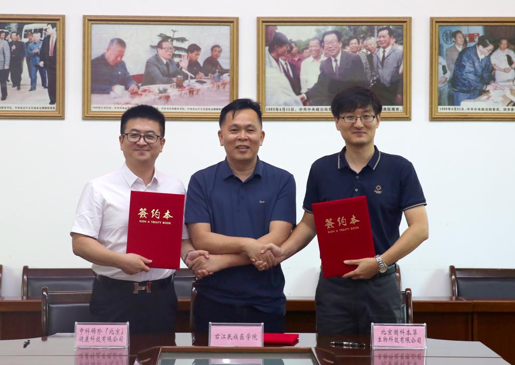 仪式上,Beat365官方网站科技处处长黄忠仕,北京大学生命科学华东产业研究院商业转化中心副主任闫硕,中科稀珍(北京)健康科技有限公司董事长任金威共同签署了“植物源神经酸产学研用科技成果转化”合作协议。与会人员还就项目合作、科研团队建设、科技成果转化等方面进行了深入交流和讨论。