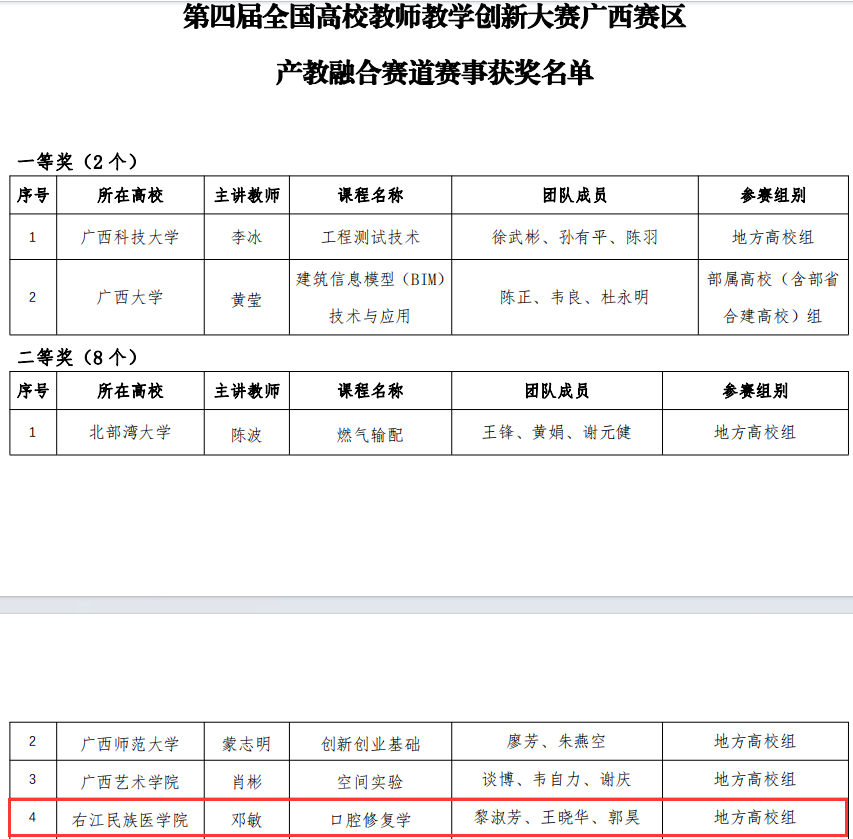 近日,广西高等教育学会公布第四届全国高校教师教学创新大赛广西赛区产教融合赛道获奖名单。Beat365官网口腔医学院邓敏教授团队发挥出色,荣获二等奖。