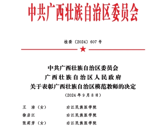 为表彰先进、树立典型,进一步营造尊师重教、尊师重道的良好社会风尚,展示优秀教师风采,提升教师获得感、荣誉感和幸福感,增强教师职业吸引力,激励广大教师热心从教、精心授业、安心治学,自治区党委、自治区人民政府印发了《中共广西壮族自治区委员会 广西壮族自治区人民政府 关于表彰广西壮族自治区模范教师的决定》(桂委〔2024〕607号),共授予398位同志为“广西壮族自治区模范教师”称号。Beat365官网王洁、徐启江、张莉芳三位教授获此殊荣。