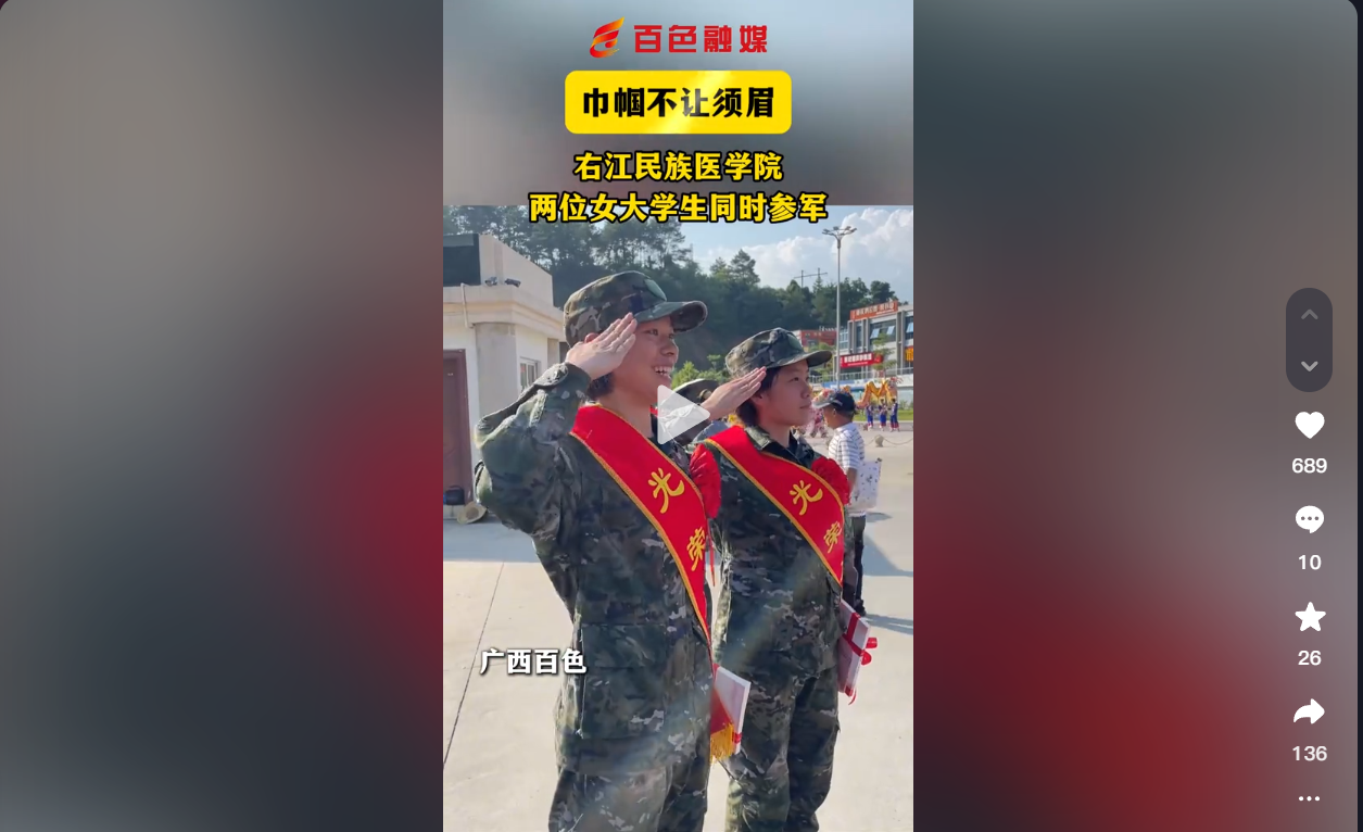 【媒体看右医】百色融媒:巾帼不让须眉,Beat365官方网站两位女大学生同时参军。