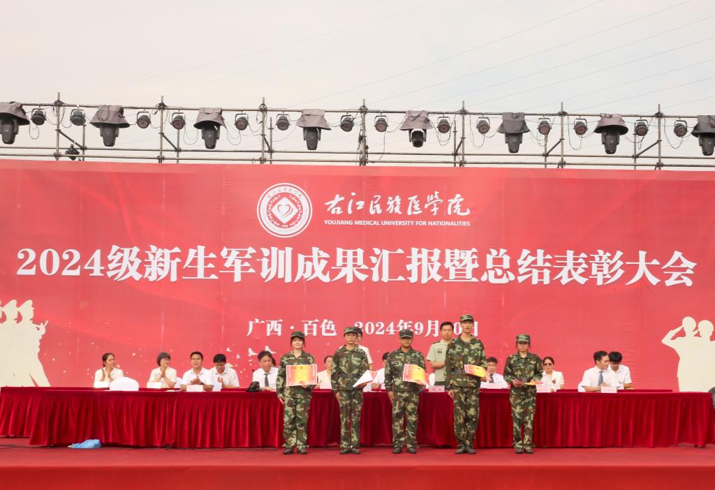 会上,武装部综合科科长王强宣读《关于表彰2024级新生军训先进集体和优秀个人的决定》,与会领导为获奖者颁奖。