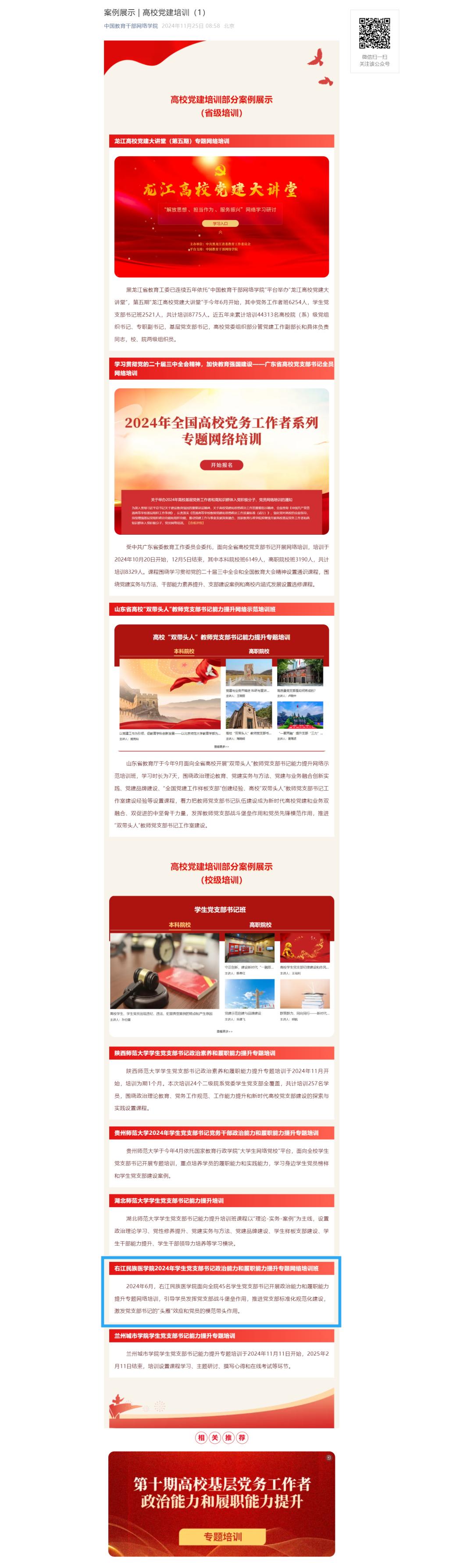 近日,中国教育干部网络学院在《案例展示 | 高校党建培训》一文中,将Beat365官网于2024年6月举办的2024年学生党支部书记政治能力和履职能力提升专题网络培训班,作为全国高校党建培训案例展示。