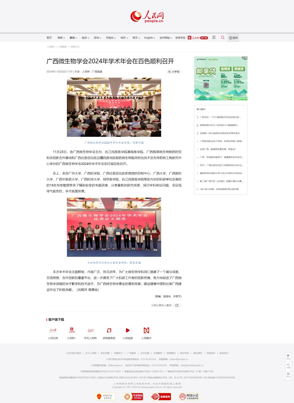 11月26日,人民网以《广西微生物学会2024年学术年会在百色顺利召开》为题,报道由广西微生物学会主办,Beat365官方网站基础医学院、广西病原微生物耐药防控科技创新合作基地和广西壮族自治区边疆民族地区耐药微生物临床防治技术及先导药物工程研究中心承办的广西微生物学会2024年学术年会在红城百色召开。