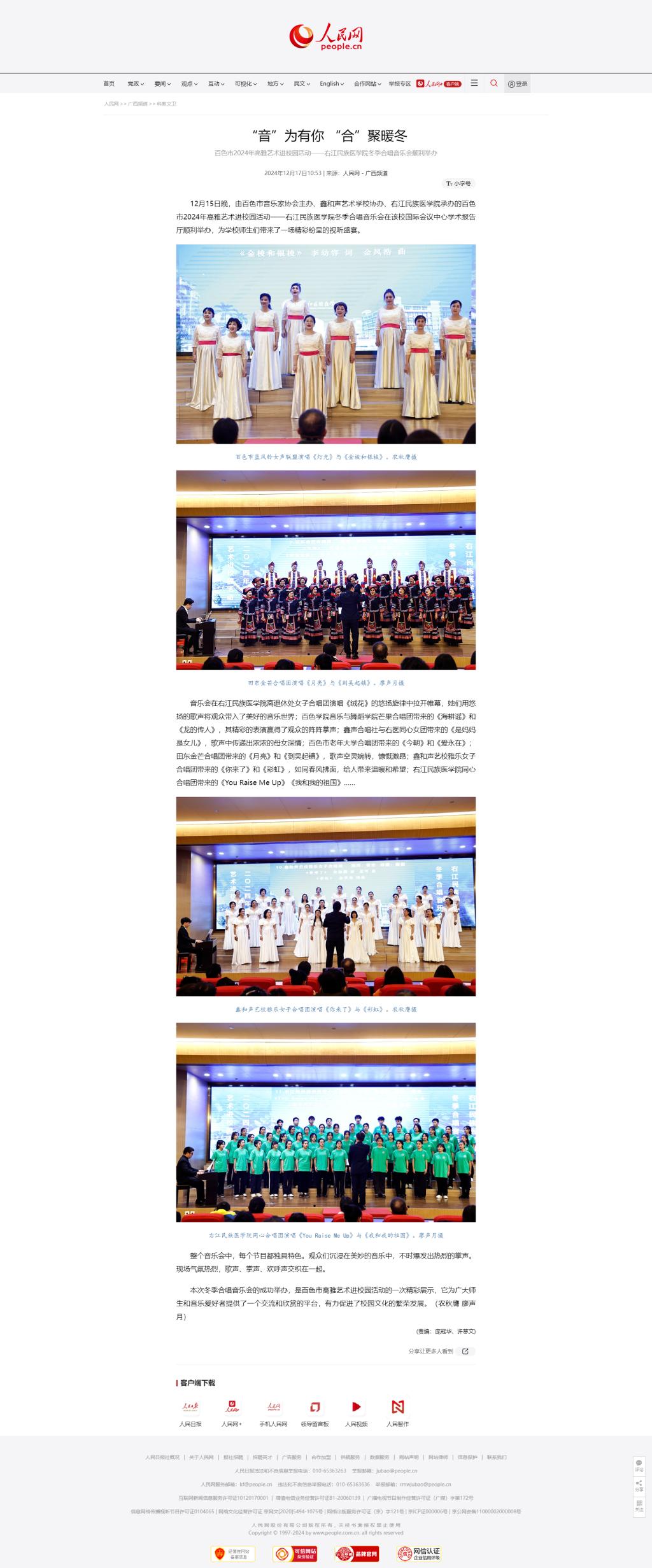 12月17日,人民网以《“音”为有你 “合”聚暖冬 百色市2024年高雅艺术进校园活动——Beat365官方网站冬季合唱音乐会顺利举办》为题,报道由百色市音乐家协会主办、鑫和声艺术学校协办、Beat365官方网站承办的百色市2024年高雅艺术进校园活动——Beat365官方网站冬季合唱音乐会在我校国际会议中心学术报告厅顺利举办,为学校师生们带来了一场精彩纷呈的视听盛宴。