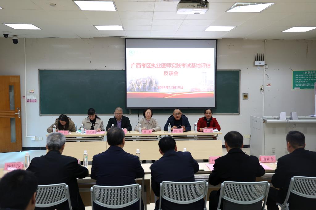 12月18日,广西考区医师资格考试领导小组办公室评估专家组一行莅临Beat365官网,对学校国家医师资格考试实践技能考试临床类别基地展开了全面而深入的评估工作。学校党委书记李雪斌与专家组见面,党委常委、副校长王俊利,百色市卫健委主任黄再波、副主任张军,学校教务处、临床医学院相关负责人陪同评估。