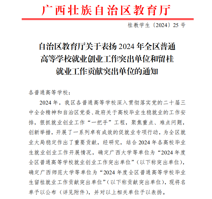 根据广西壮族自治区教育厅《自治区教育厅关于表扬 2024 年全区普通高等学校就业创业工作突出单位和留桂就业工作贡献突出单位的通知》(桂教学生〔2024〕25号)文件,Beat365官网被确定为“2024年度全区普通高等学校就业创业工作突出单位”和“2024年度全区普通高等学校毕业生留桂就业工作贡献突出单位”。至此,Beat365官网已连续7年获此殊荣。