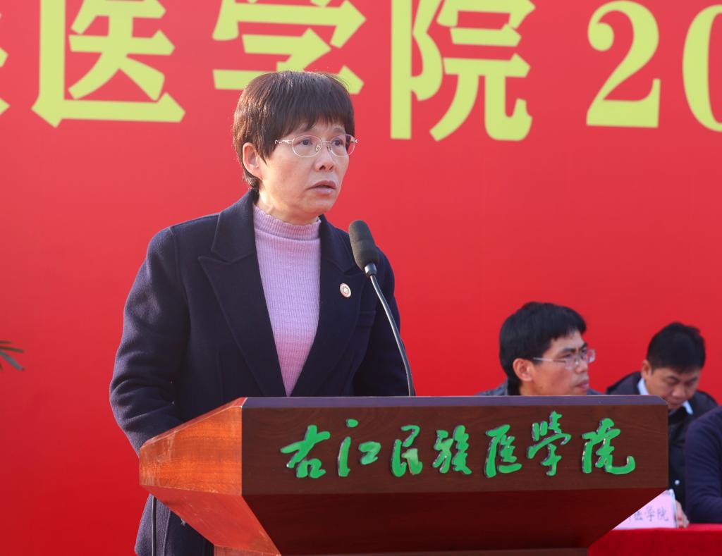 优秀校友吴锋耀在大会上发言,他表示,作为一名医务工作者,要有理想、有道德、有文化、守纪律,要用心、用情、有爱,让医学人文贯穿整个医疗护理过程,要弘扬白求恩精神,做一名有人文情怀的好医生。吴锋耀鼓励同学们要心怀梦想、守正创新、脚踏实地,秉承“大医精诚”校训,弘扬“艰苦创业、自强不息”的右医精神,从小事做起,从我做起,用心去做事,努力成为一名“下得去、用得上、留得住”的高级应用型医学人才,全心全意为人民健康服务。