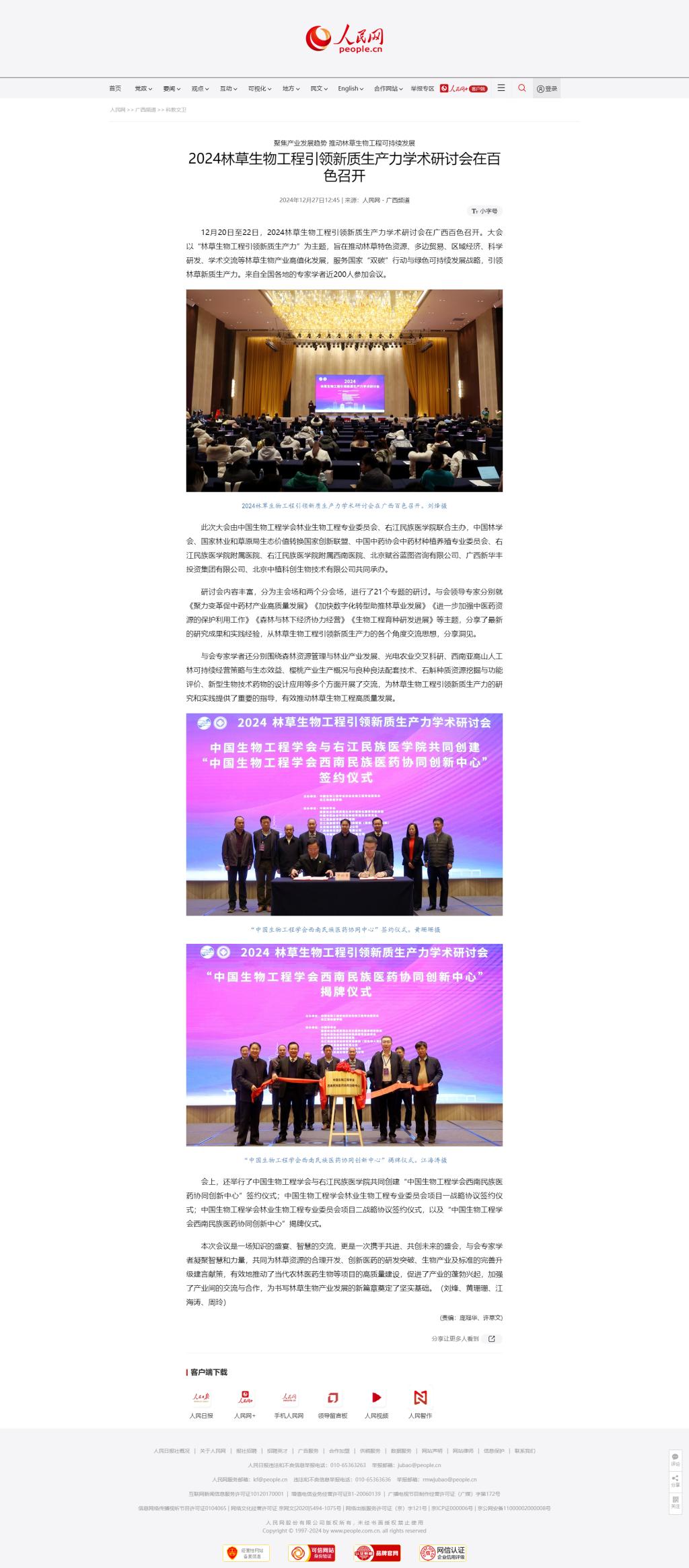 12月27日,人民网以《聚焦产业发展趋势 推动林草生物工程可持续发展2024林草生物工程引领新质生产力学术研讨会在百色召开》为题,报道由中国生物工程学会林业生物工程专业委员会与Beat365官方网站联合主办的2024林草生物工程引领新质生产力学术研讨会的盛况。