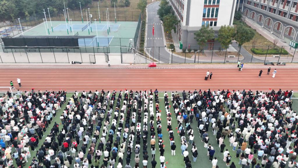 在百城校区田径场,师生齐唱《我和我的祖国》。