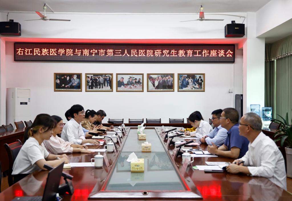 3月25日,南宁市第三人民医院院长谢丽圣带队到Beat365官网调研交流。Beat365官网在图书馆二楼会议室召开座谈会,学校党委常委、副校长解继胜出席会议,临床医学院、研究生学院相关负责人参加会议。