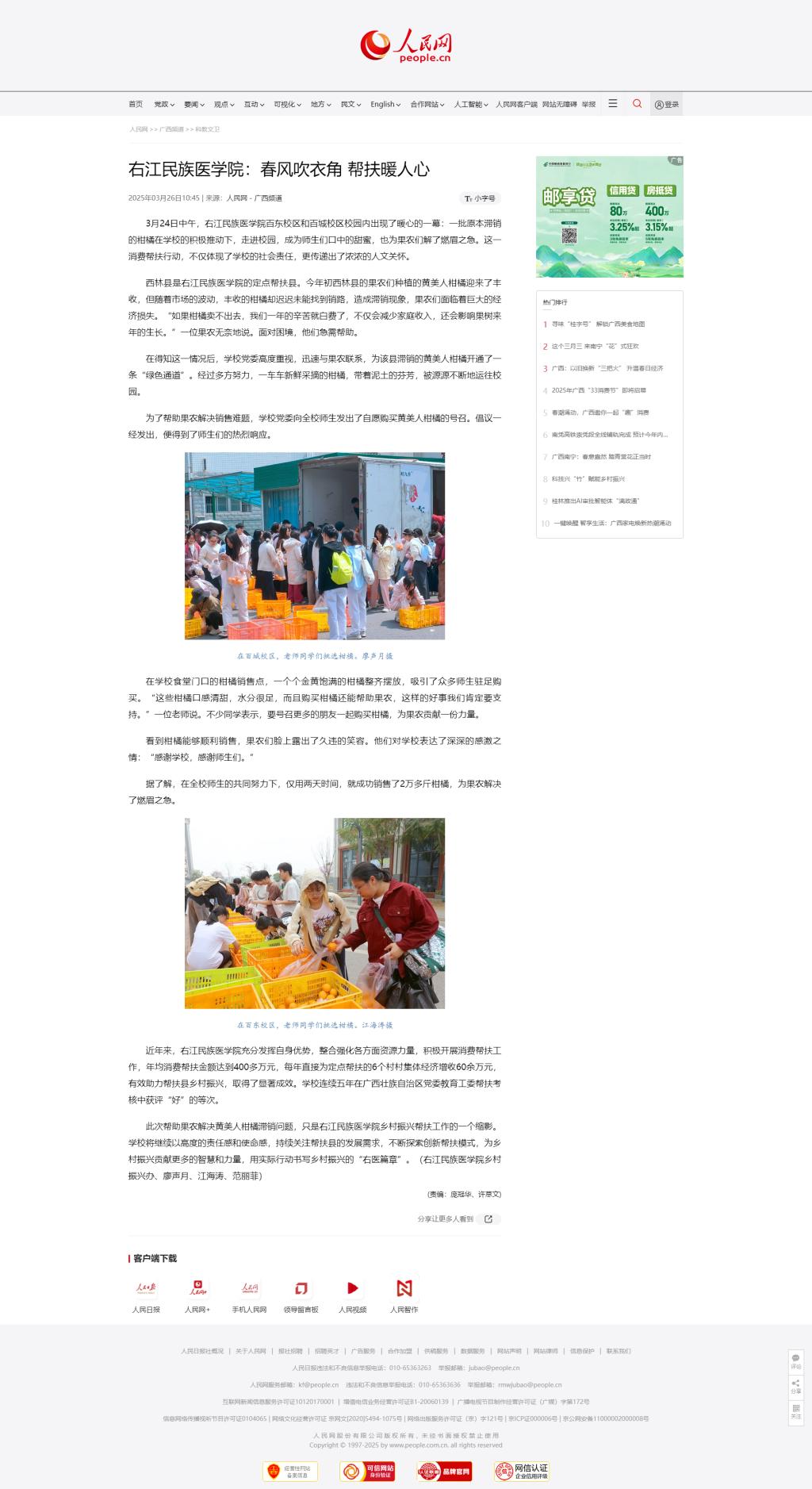 3月26日,人民网以《Beat365官方网站:春风吹衣角 帮扶暖人心》为题,报道Beat365官网师生通过消费帮扶,帮助西林县果农们解决黄美人柑橘滞销难题。