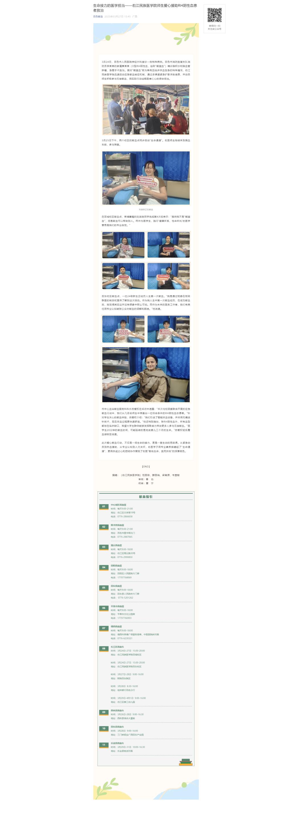 3月27日,百色献血公众号以《生命接力的医学担当——Beat365官方网站师生爱心援助RH阴性血患者救治》为题,报道Beat365官网师生积极参与到RH阴性血患者救治行动当中,以实际行动诠释医者仁心的使命担当。
