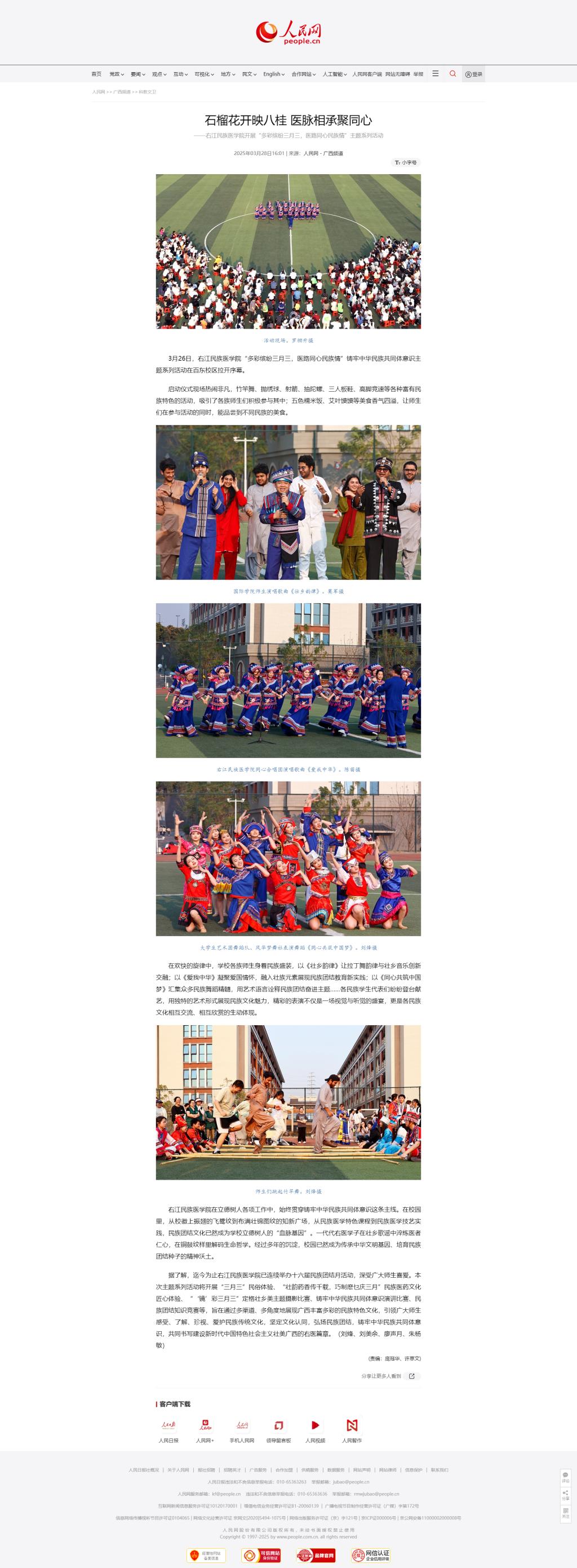 3月28日,人民网以《石榴花开映八桂 医脉相承聚同心》为题,报道Beat365官网开展“多彩缤纷三月三,医路同心民族情”铸牢中华民族共同体意识主题系列活动启动仪式盛况。